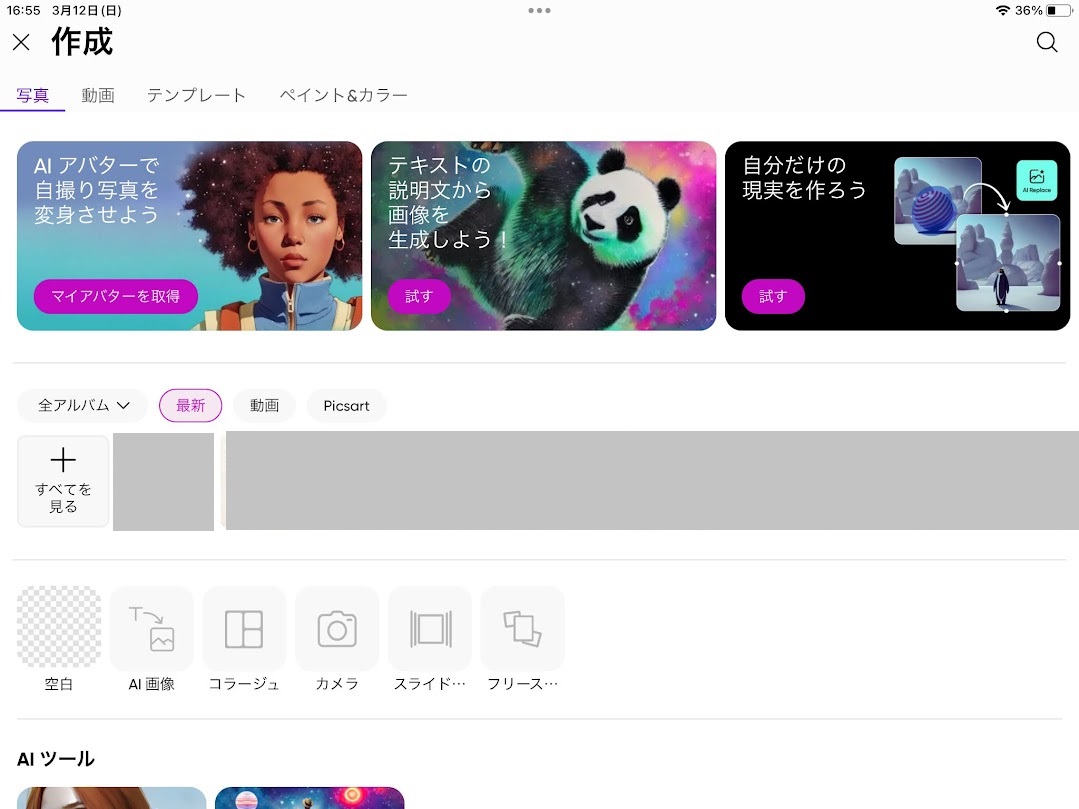 カメラで撮影した写真や、PicsArt内の素材も利用可能です。