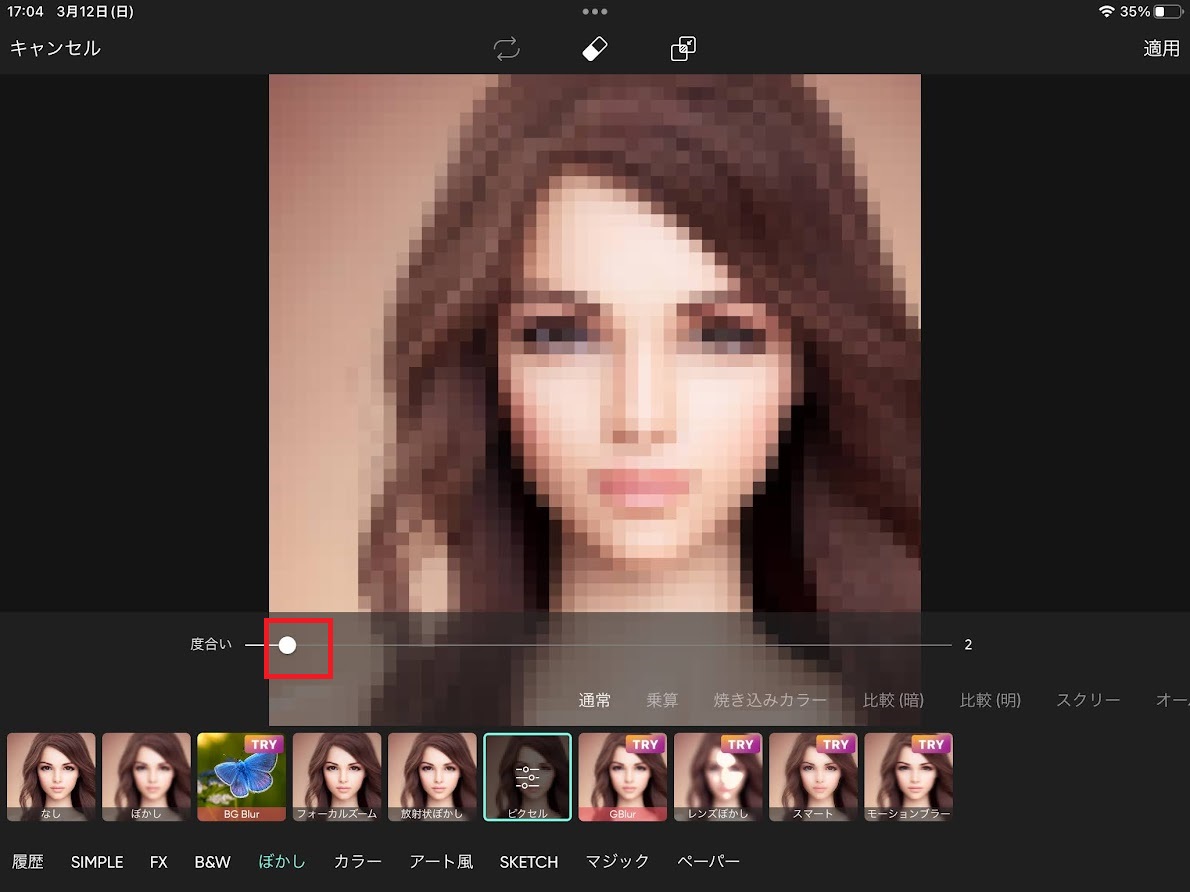 これで、指定した範囲のみをピクセル化してモザイクをかけることができます。