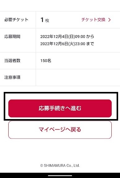 チケットがあれば画面が切り替わり応募の詳細が出てきます。